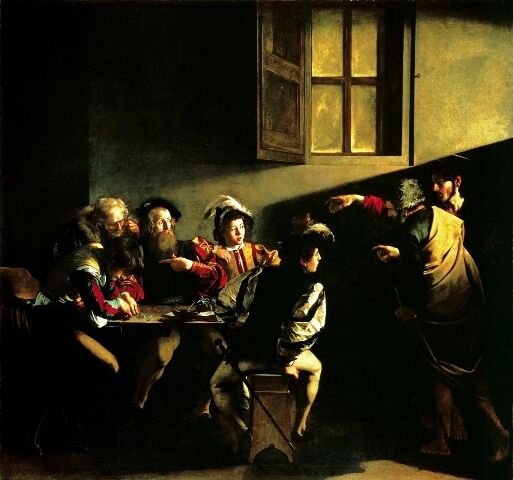 La “Vocazione di San Matteo” s'imposta sul tema della luce che, entrando dall'angolo destro in alto, rende visibile la scena collocata nel chiuso ambiente in penombra. Una striscia di luce accompagna il gesto del Cristo, che chiama a sé Matteo il quale, stupito, ripete lo stesso gesto di Gesù con l'indice: la luce è simbolo della Grazia Divina che salva chi vuole intraprendere la retta via e che non tocca chi, come il gabelliere a sinistra, che continua a contare i denari, condanna se stesso alla pena eterna.