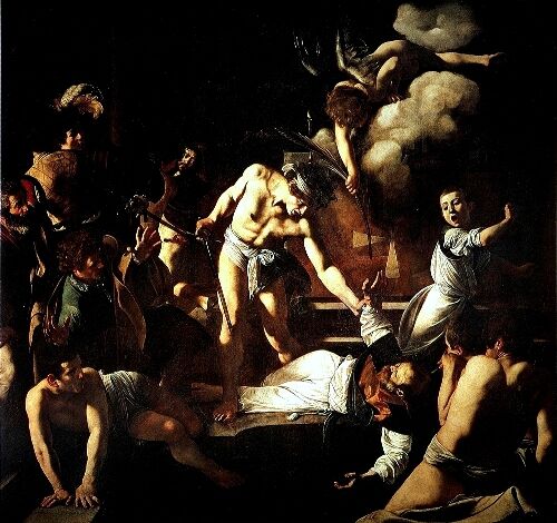 Nel “Martirio di San Matteo” il sicario ha appena trafitto San Matteo che, sanguinante, al limite tra vita e morte, cerca verso l'alto la salvezza, accogliendo la palma del martirio che l'angelo viene ad offrirgli; vi sono persone che assistono attonite alla scena mentre altre fuggono come il ragazzo urlante che volge indietro lo sguardo terrorizzato. All'ordinata composizione della Vocazione, si contrappone questa del Martirio, dove l'orrore della morte si confonde con la gioia della salvezza e della rivelazione.