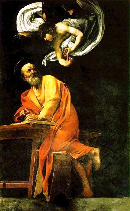 Il “San Matteo e l’angelo” è la seconda versione di Caravaggio sullo stesso oggetto. Nella prima versione San Matteo è raffigurato come un contadino analfabeta la cui mano è direttamente guidata dall'angelo che non solo gli detta, ma sembra proprio il vero autore del testo evangelico. Giudicata questa opera poco decoroso, il pittore ne realizzò nel 1602 la seconda versione dove il rapporto diretto tra umanità ignorante e divinità che istruisce viene eliminato, spostando l'angelo in volo in alto e, soprattutto, conferendo al santo l'aspetto del dotto saggio che, stavolta, è in grado di scrivere da solo le parole che l'angelo gli detta. Un effetto straordinario è dato dall'incontro degli sguardi dei due personaggi.