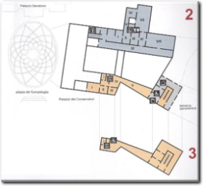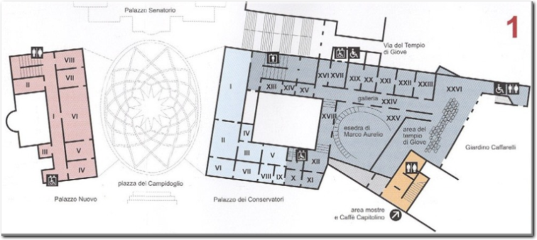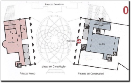 La piazza del Campidoglio nel suo aspetto attuale fu progettata intorno alla metà del Cinquecento da Michelangelo Buonarroti che concepì la piazza ed i palazzi come un insieme funzionale ad un'organica unità, anche se la completa attuazione è stata iin parte effettuata nel corso dei secoli successivi, con aggiunte e modifiche. Il palazzo Senatorio fu edificato tra la metà del XII secolo e l'ultimo quarto del XIII secolo sulle rovine dell'antico Tabularium, e fu sede dal 1144 del Comune di Roma: la facciata principale del palazzo duecentesco si apriva verso la futura piazza del Campidoglio, poi con una serie di loggiati con archi a tutto sesto disposti su tre livelli. Nel corso del Trecento il palazzo comincia a chiudersi come una fortezza; molte arcate dei loggiati furono tamponate e torri costruite da Bonifacio IX, poi da Martino V (1427 circa) e Niccolò V (1451), rinforzarono i fianchi dell’edificio dominato da una torre merlata quattrocentesca. La monumentale scalinata a doppia rampa che Michelangelo progettò tra il 1542 e il 1554, svolge la funzione di accesso al nuovo palazzo Senatorio, il cui progetto fu ripreso e realizzato da Giacomo della Porta nell'ultimo decennio del Cinquecento, e costituisce un ideale raccordo plastico tra la piazza e il palazzo ed elegante ambientazione architettonica per le due statue antiche del Nilo e del Tevere.. L'antica torre quattrocentesca fu sostituita dalla grandiosa torre campanaria realizzata da Martino Longhi il Vecchio tra il 1578 e il 1582. L'area trapezoidale della piazza è delimitata dai due Palazzi dei Conservatori e Nuovo contrapposti, che con le loro facciate specularmente identiche, con andamento divergente rispetto al Palazzo Senatorio, racchiudono lo spazio come quinte scenografiche. Michelangelo aveva disegnato il basamento della statua equestre in bronzo dorato di Marco Aurelio e ne aveva fatto il fulcro della piazza, immaginandola al centro di uno spazio ovale riempito da un disegno a stella. La pavimentazione dell'area, fino ad allora sterrata, fu subito attuata ma la realizzazione del motivo stellato è stata effettivamente eseguita soltanto nel 1940. La Cordonata di accesso al Campidoglio che saliva dal Campo Marzio, spostò poi definitivamente verso la città moderna l'asse del colle capitolino, in età antica rivolto verso il Foro Romano. La costruzione del Palazzo dei Conservatori risale alla metà del 1400. L'edificio era caratterizzato nel suo aspetto originario da un porticato al piano terra e da finestre a croce guelfa al piano nobile, oltre che da una fila di finestrelle nel mezzanino. Michelangelo ne ridisegnò la facciata scandendola con paraste giganti di ordine corinzio su alti piedistalli, fiancheggiate da colonne nel portico del pianterreno; come nel Palazzo Senatorio una balaustra con statue concludeva in alto l'edificio. La trasformazione interessò anche la conformazione interna del palazzo, riflessa dalla mutata articolazione delle finestre del piano nobile; quella centrale fu in seguito realizzata da Giacomo della Porta molto più ampia delle altre, in deroga al progetto michelangiolesco. Il Palazzo Nuovo fu costruito invece nel XVII secolo, sotto la direzione di Girolamo Rainaldi e del figlio Carlo; il suo orientamento obliquo, che riprende quello del contrapposto Palazzo dei Conservatori, era già segnato in precedenza da un grande muro di contenimento dell'altura di S. Maria in Aracoeli, al centro del quale era stata posta la fontana con la statua del "Marforio", poi sistemata nel cortile del Museo Capitolino. La costruzione del Palazzo Caffarelli-Clementino, iniziata da Ascanio Caffarelli nel 1538, fu completata dopo il 1680. Si affacciava sul Cortile del Palazzo dei Conservatori ed includeva al suo interno due giardini (il Giardino Caffarelli e quello poi denominato Giardino Romano); il grande portale su Via delle Tre Pile costituiva l'ingresso monumentale alla proprietà. Il palazzo ha subito nel corso dei secoli molte trasformazioni, che ne hanno modificato la conformazione originaria; dall'inizio dell'Ottocento alla fine della prima guerra mondiale l'edificio fu occupato dall'ambasciata di Prussia, poi nel 1918 fu recuperato dal Comune di Roma e parzialmente demolito: al posto dei piani alti dell'ala orientale fu ricavata una grande terrazza (Terrazza Caffarelli), mentre al piano terreno, in parte smantellato per gli scavi del tempio di Giove Capitolino, fu allestito un settore museale.