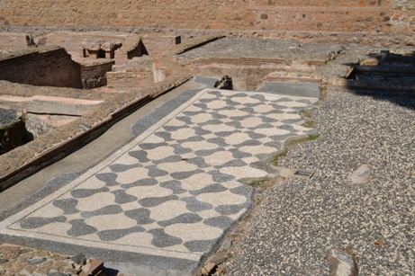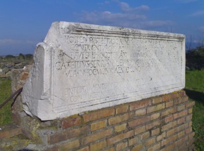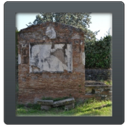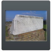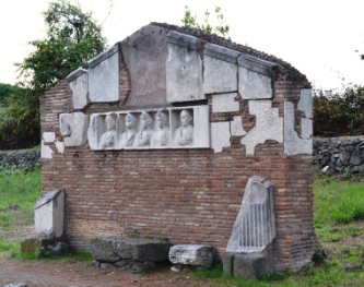 Il sepolcro attribuito alla famiglia di Tiberio Claudio Secondino, liberto dell'imperatore Claudio, per l'iscrizione è una tomba della fine del I secolo d.C. nella quale furono sepolti il capo famiglia, di professione esattore di banca, copista e messo, la moglie e due figli. Il sepolcro di Quinto Apuleio è stato ricostruito con un pezzo dell'iscrizione e un grosso frammento di lacunare fiorito in travertino che apparteneva ad un soffitto, poi una grata che chiude l'ingresso di una camera funeraria seminterrata, e un torso di statua. Il sepolcro cd. a tempietto è disposto su due piani, con scalinata d’accesso su alto podio, che portava al piano superiore, in cui si svolgevano le cerimonie funebri; dal lato posteriore del monumento si accedeva invece alla camera funeraria, ricavata all’interno del podio. Il sepolcro è caratterizzato dall’uso esclusivo del laterizio di due colori, tipico della metà del II secolo d.C., impiegato anche per le parti decorative.