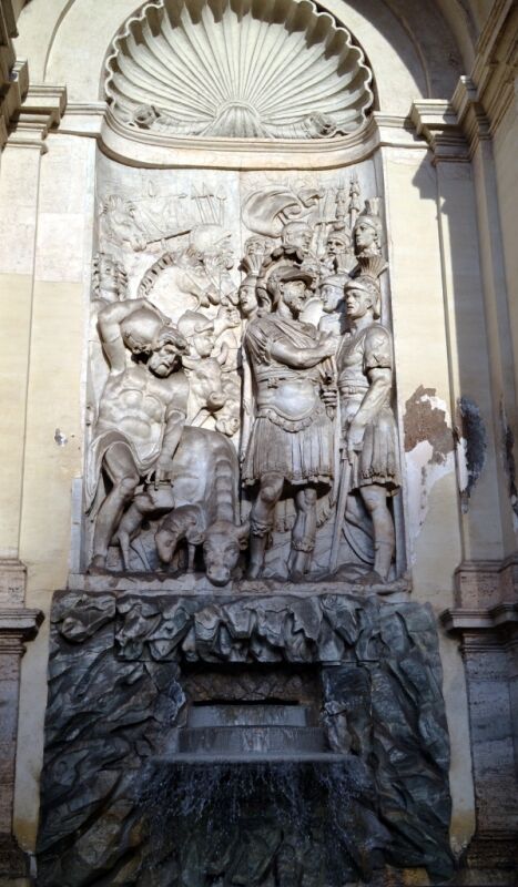 È la mostra dell'Acqua Felice. Inaugurata nel 1587 insieme all'acquedotto, fu realizzata su disegno di Domenico Fontana, architetto di fiducia di Sisto V, ispirandosi alle tipologie dell'arco trionfale e del ninfeo. Sotto il grande attico (iscrizione con soprastante stemma sorretto da angeli) si aprono tre nicchioni: in quelli laterali, Aronne guida il popolo ebreo a dissetarsi (G.B. Della Porta) e Giosuè fa attraversare agli Ebrei il Giordano asciutto (F. Vacca), al centro la colossale e sproporzionata statua del Mosè di L. Sormani e P. Bresciano. Dalla base dei nicchioni l'acqua sgorga nelle vasche ornate di quattro leoni (copie degli originali egizi trasferiti da Gregorio XVI nei Musei Vaticani); la balaustra marmorea che le cinge proviene da un edificio del tempo di Pio IV.