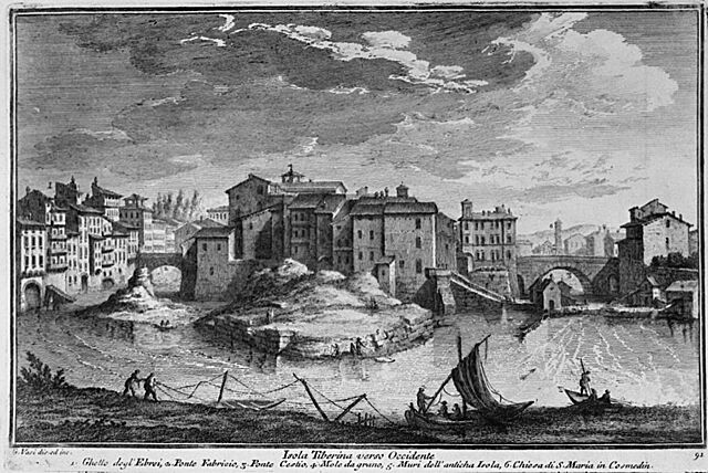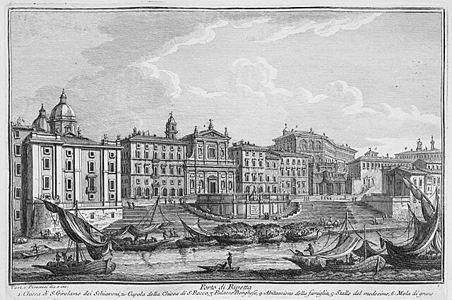 Nella metà del XVIII secolo, Giuseppe Vasi poté aprire un suo studio-bottega presso Palazzo Farnese in Roma, a quel tempo di proprietà di Carlo III di Borbone, Re di Napoli e di Sicilia. La bottega del corleonese non si limitava però alla sola produzione di stampe a incisione, egli infatti fu in grado di promuovere un'attività che fosse anche didattica, condividendo collezioni di antichità, opere originali e copie di reperti archeologici che favorissero la conoscenza del mondo classico.