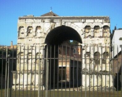 Situato all'inizio di via del Velabro, l’Arco di Giano è un arco quadrifronte fatto costruire da Costanzo II nel IV secolo d.C. ai margini orientali del Foro Boario. L'arco è formato da quattro piloni in opera a sacco rivestiti di lastre marmoree che sostengono al centro una volta a crociera, ornati sui lati esterni, al di sopra dell'alto zoccolo, da due file di tre nicchie semicircolari con calottine a conchiglia. Sui blocchi di chiave degli archi sono riprodotto le figure di Giunone e Roma (le figure sedute) e Minerva e Cerere (in piedi). Non rimane più nulla dell'attico, il cui nucleo in mattoni venne demolito nel 1830, e del coronamento finale, mentre nella chiesa di San Giorgio al Velabro sono conservati i resti di quella che doveva essere l'iscrizione dedicatoria.