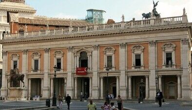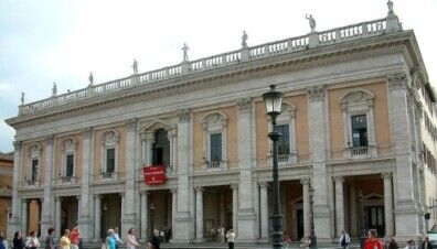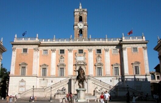 Il Palazzo Senatorio venne edificato sui resti del Tabularium, l'archivio di Stato di Roma antica del I secolo a.C., dove si conservavano leggi e testi ufficiali, incise sulle Tabulae bronzee, e nel quale si riunivano i magistrati. Nel 1299 fu restaurato e fino al XVI secolo l'edificio mantenne le sembianze della fortezza medievale, di cui Michelangelo conservò le mura, ideandone una nuova facciata, realizzata tra 1582 e 1605 da Giacomo della Porta e Girolamo Rainaldi, che riadattarono i disegni dell'artista, preservando soltanto la scala esterna a due rampe convergenti (1547-1554). La Statua di Minerva Seduta, posta nella nicchia, è affiancata dalle statue distese del Tevere e del Nilo realizzate per le terme di Costantino e spostate in Campidoglio dal 1518. La Torre Municipale fu eretta tra il 1578 ed il 1582 da Mariano Longhi il Vecchio, che sostituì la preesistente, di epoca medievale. Nel Palazzo Senatorio ancora oggi si riunisce il Consiglio Comunale di Roma, nel salone maggiore dell'edificio, l'Aula Consiliare, dove si trova una statua di Giulio Cesare. II palazzo posto a sinistra della piazza capitolina fu denominato "Palazzo Nuovo" perché edificato più tardi rispetto al Palazzo Senatorio e al Palazzo dei Conservatori. Inserito fin dall'inizio nel generale progetto di Michelangelo, fu costruito da Girolamo e Carlo Rainaldi nel 1655 e completato in più fasi, nell'arco di quasi due secoli. Il palazzo è noto anche come Museo Capitolino anche se in realtà sia Palazzo Nuovo che quello dei Conservatori, ospitano il complesso museale.