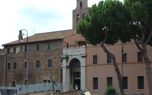 Lungo via della Salara Vecchia, via della Curia e via dei Fori Imperiali si costeggia il muro di cinta da cui si può ammirare uno dei più bei panorami del Foro Romano. La Basilica dei S.S. Cosma e Damiano nasce dalla fusione di due edifici classici, il Tempio di Romolo, sulla via Sacra, voluto dall'Imperatore Massenzio in onore di suo figlio, e l'antica biblioteca del Foro della Pace.