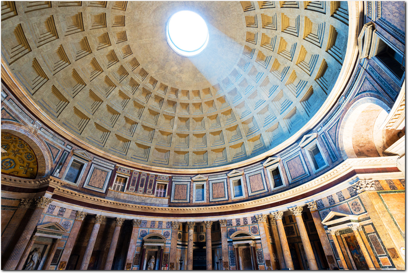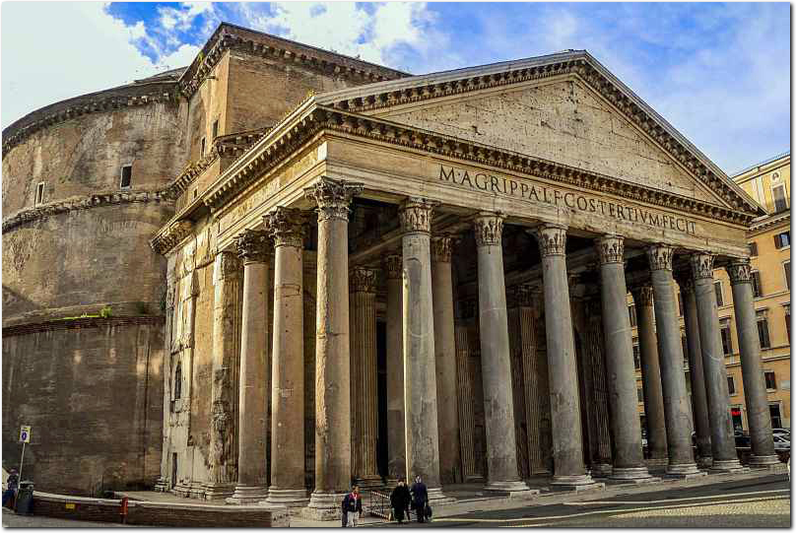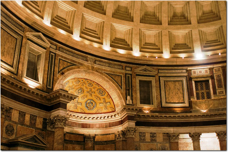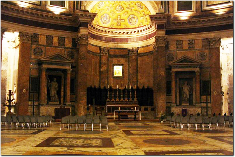E' uno dei più celebri monumenti di Roma nonché uno dei più importanti modelli per l’architettura di ogni epoca. Fatto costruire da Marco Vipsanio Agrippa nel 27 a.C. in onore di tutti gli dei, fu fatto restaurare da Domiziano dopo l'incendio dell'80 e ricostruito da Adriano tra il 118 ed il 125, giungendo ai tempi nostri quasi integro. Di particolare interesse la sua cupola, capolavoro della tecnica e dell'architettura romana per essere anche la più grande mai costruita all'epoca: è alta 43 metri e dal diametro di base uguale a quella di San Pietro, 42,56 metri. Nel 609 Bonifacio IV lo consacrò alla Madonna e a tutti i Martiri. Nel medioevo divenne una fortezza e nel 1625 per volere di Urbano VIII fu asportato il rivestimento bronzeo delle travi del portico con il quale il Bernini realizzò i cannoni di Castel Sant'Angelo ed il baldacchino di San Pietro. Il gesto del pontefice ispirò la pungente pasquinata: "quod non fecerunt barbari, fecerunt Barberini". All'esterno l'edificio presenta un pronao largo 33 metri e profondo 16, con 16 colonne in granito grigio e rosa. Dal portale con battenti in bronzo si accede all'interno a pianta circolare con sette grandi nicchie che si alternano a otto edicole con colonnine. Nel 1870 è divenuto sacrario dei Re d’Italia: qui riposano Vittorio Emanuele II, Umberto I e Margherita di Savoia; inoltre vi è stata collocata la tomba di Raffaello Sanzio. Il tempio è composto da un’aula circolare coperta a cupola, preceduta da un pronao con 16 colonne monolitiche in granito grigio e rosa alte 13 metri, di cui 8 sulla fronte e le altre suddivise in profondità a formare tre navate; il pronao è coronato da un timpano che in origine ospitava nel frontone un rilievo in bronzo. Superato l’enorme portone bronzeo si entra all’interno dell’aula le cui pareti ed i pavimenti sono rivestiti interamente di marmi policromi; sulle pareti sono ricavate sette nicchie alternativamente semicircolari e rettangolari comprese tra colonne corinzie; copre l’aula una grandiosa cupola del diametro di 43 metri con oculus centrale, unica fonte di luce per l’interno.Tra le opere d’arte che vi sono custodite di rilievo l'affresco dell’Annunciazione attribuito a Melozzo da Forlì, epigrafi funebri dei virtuosi Flaminio Vacca, Taddeo Zuccari, Perin Del Vaga, e, sull’altare maggiore, Madonna col Bambino romano-bizantina del VII secolo.