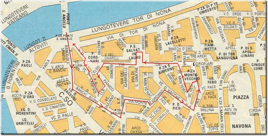 E’ una passeggiata che attraversa gran parte del Rione Ponte, uno dei più ricchi di memorie e soprattutto di edifici rappresentativi del Rinascimento e del Barocco. Ponte prende il nome dal Ponte Sant’Angelo, che ricalca il più antico ponte Elio, fatto costruire dall’imperatore Adriano e che conduceva all‘attuale Castel Sant’Angelo. Il rione cominciò ad essere abitato e crebbe fino a diventare un vero quartiere sul finire del Medioevo: gli abitanti potevano contare su un crescente numero di attività legate al flusso dei pellegrini che attraversavano il ponte, diretti alla basilica di S. Pietro; l’economia della zona fu sempre ricca di locande e di osterie, oltre ad avere un proficuo commercio di oggetti sacri (via dei Coronari prende il nome proprio dai venditori di corone) e una moltitudine di botteghe che svolgevano attività di cambiavalute per i pellegrini ed i forestieri. Un’altra delle attività economiche di Ponte era quella dei conciatori di pelle, tanto che nel IV secolo il rione era detto “pontis e scorticlarium”. Dopo il trasferimento della sede papale dal Laterano al Vaticano, il rione crebbe di importanza per la sua disposizione viaria, le sue strade furono rifatte ed in seguito furono pavimentate altre vie del Rione come le attuali via di Tor Sanguigna, via della Maschera d’Oro e Via degli Acquasparta. Il rione ebbe sempre un intensa attività urbanistica: molte furono le case costruite in pieno Cinquecento sia da famiglie aristocratiche che da famiglie mercantili alla cui decorazione concorsero gli artisti presenti a Roma come Raffaello, Giulio Romano, Perin del Vaga, Federico Zuccari, Pirro Logorio ed altri. Mentre si rifondavano o si ricostruivano chiese, il Rione sviluppava la propria fisionomia rinascimentale in tre località topograficamente localizzate: Via dei Coronari con i venditori degli oggetti religiosi, Via dei Banchi con i cambiavalute e i banchieri e tra Monte Giordano e Via dell’Orso con le “cortigiane”.